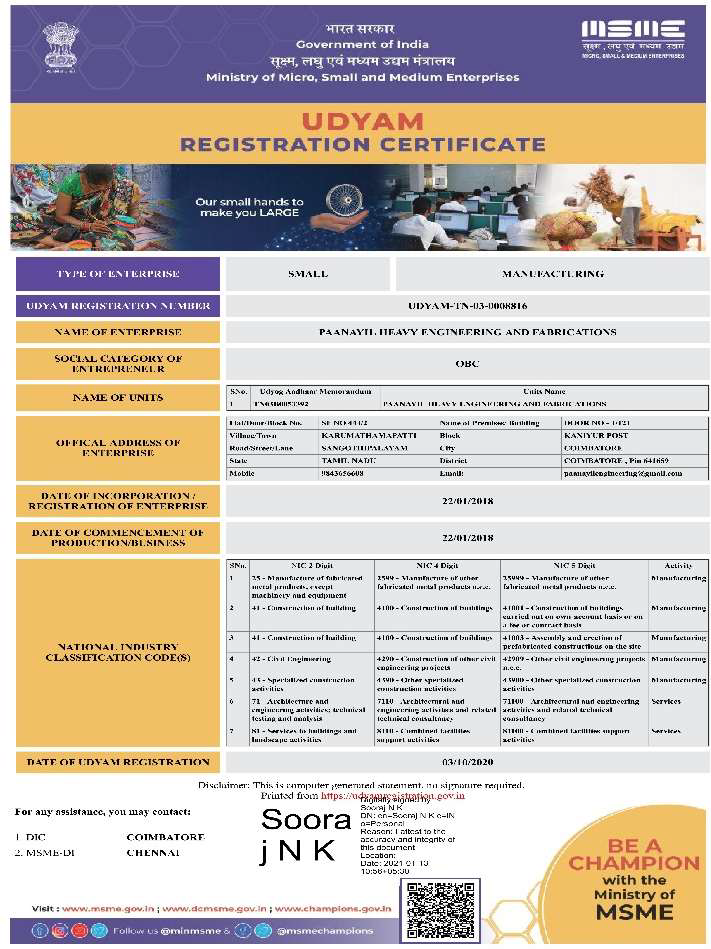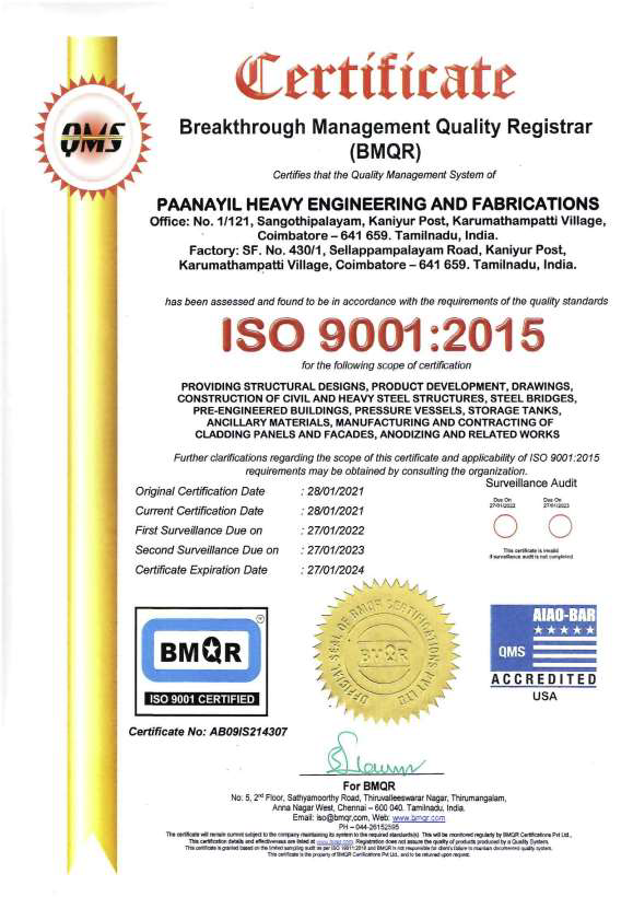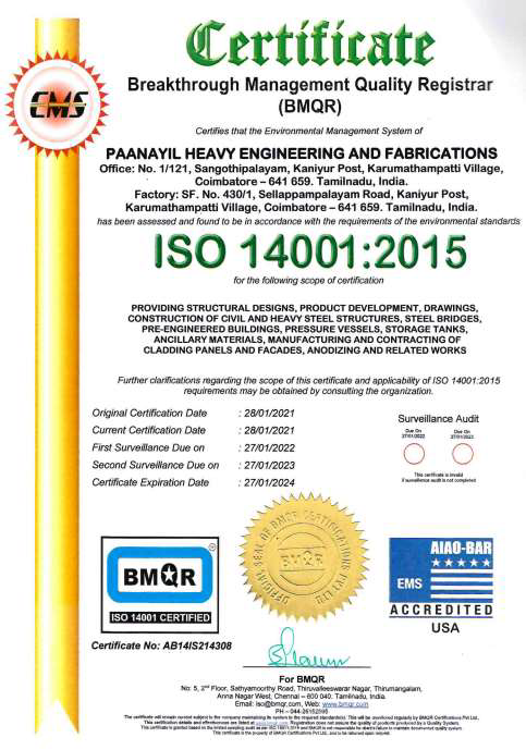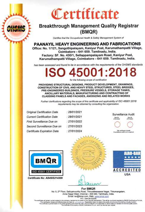 Paanayil Heavy Engineering and Fabrications (PHEF) is an Engineering unit and steel structure construction company established in the year 2018 at Sangothipalayam village, Kaniyur, Karumathampatti, Coimbatore -641 659. PHEF is an ISO 9001-2015, 14001-2015, 45001-2015 certified company registered under Micro Small Medium Enterprises (MSME) Development Board of India. Paanayil Builders and Developers private limited and Paanayil Heavy Engineering and Fabrications both companies are the sister concern of Riyadh villas contracting est, Riyadh, KSA., is general contracting company largely working for Saudi Aramco, SECO, GCCIA, ADA, LULU etc.,